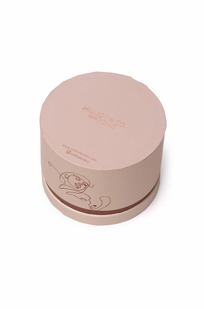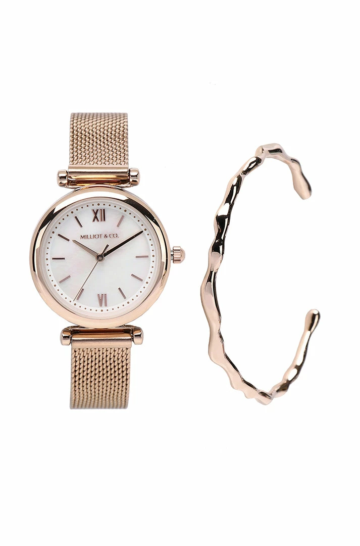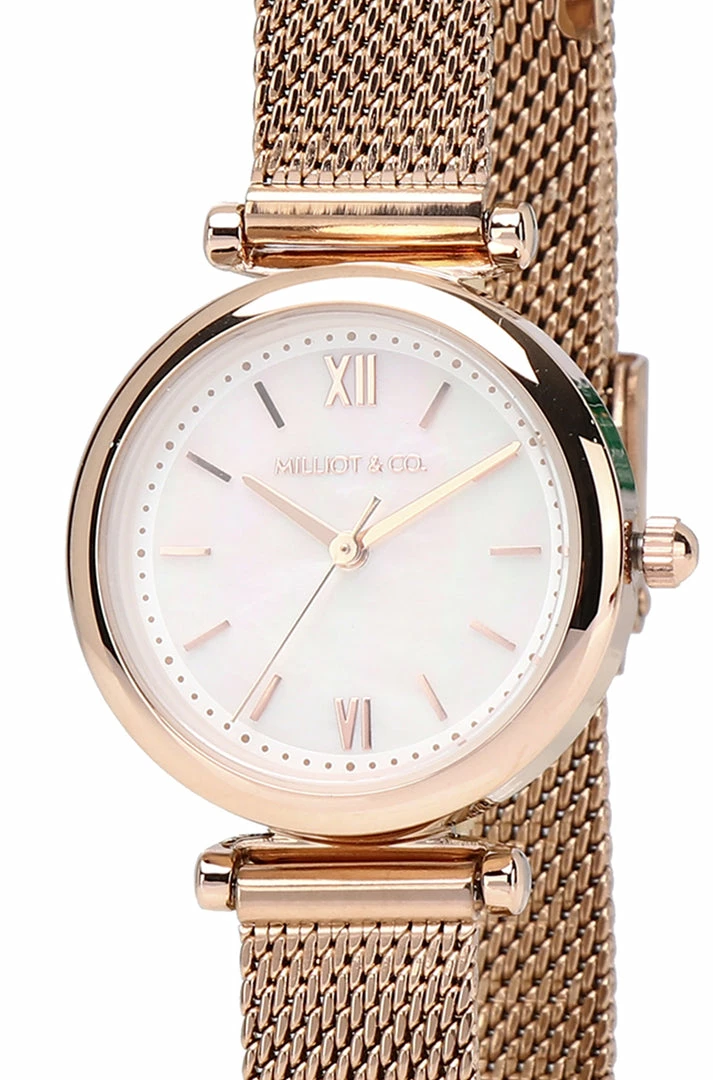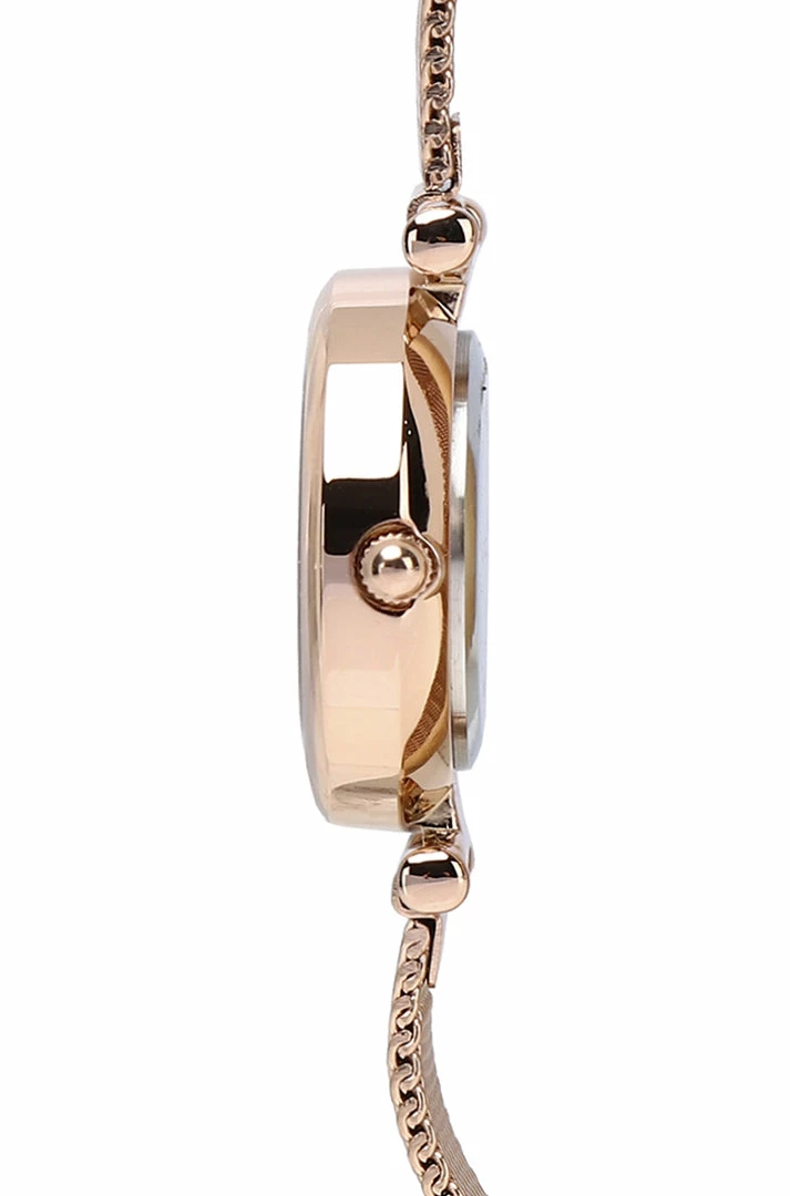 – Rose gold tone mesh strap watch with minimalist dial