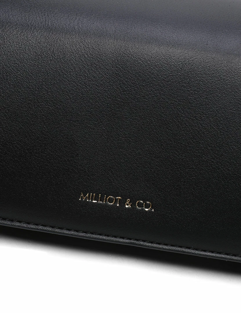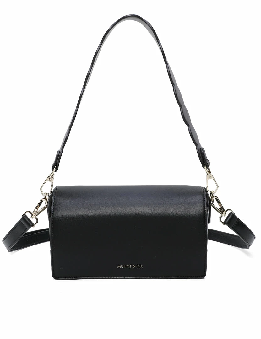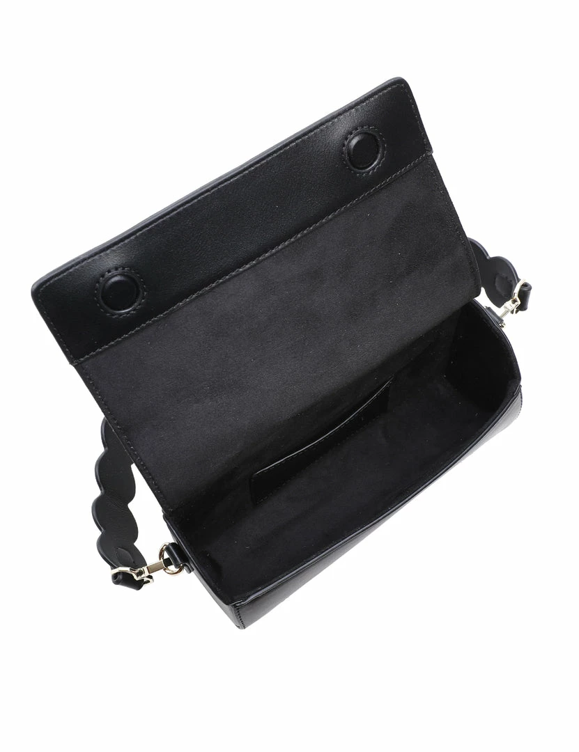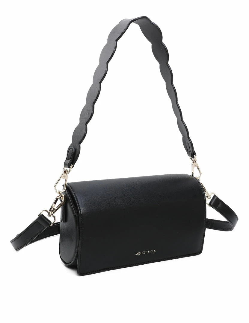– Solid tone faux leather bag with scallop strap