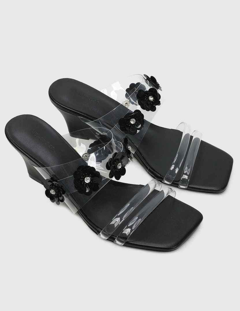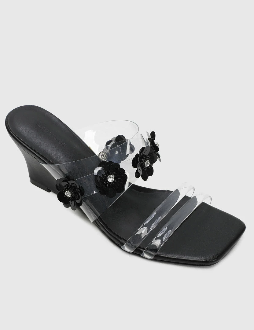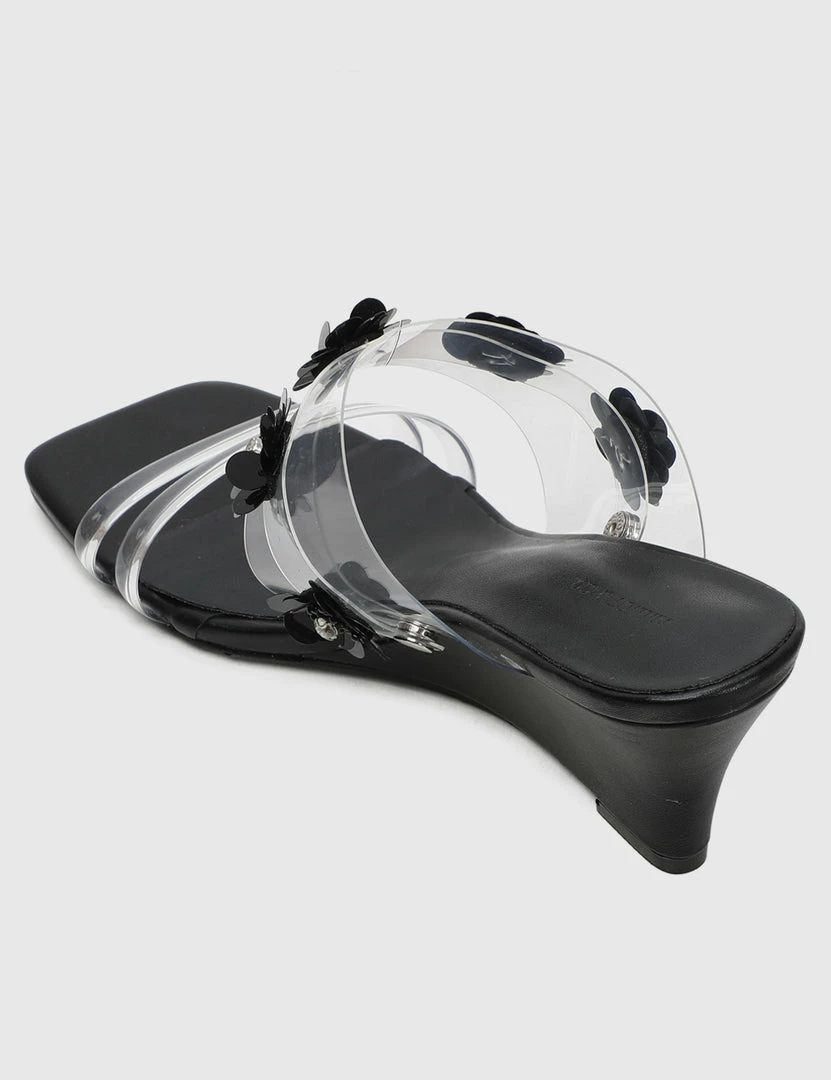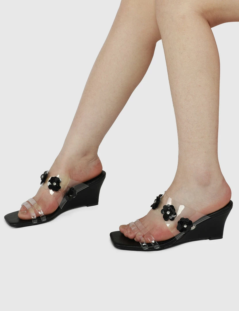 – Transparent upper wedges with floral applique detail