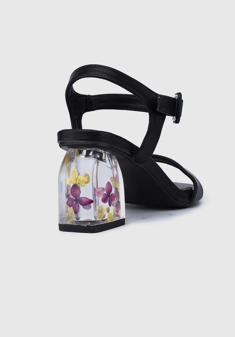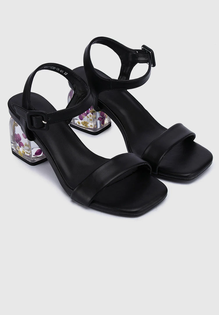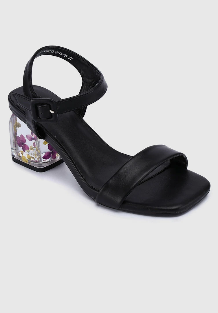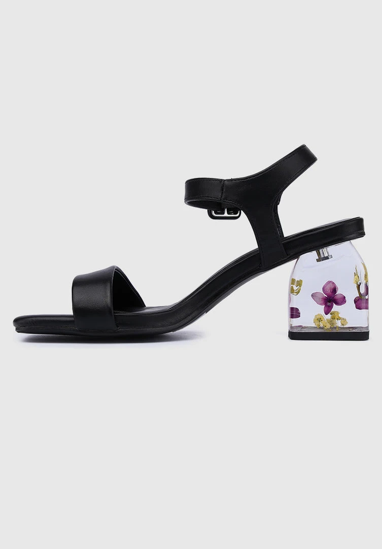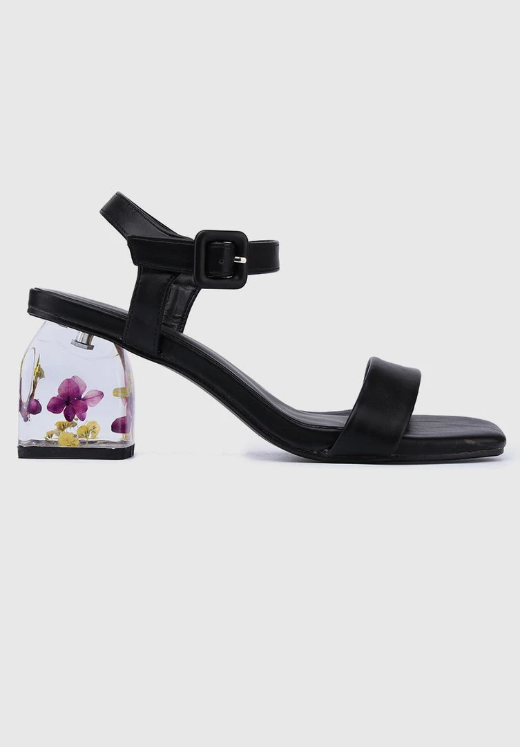 – Faux leather shoes with flower insert block heels