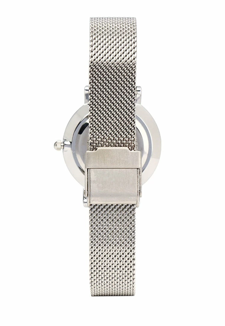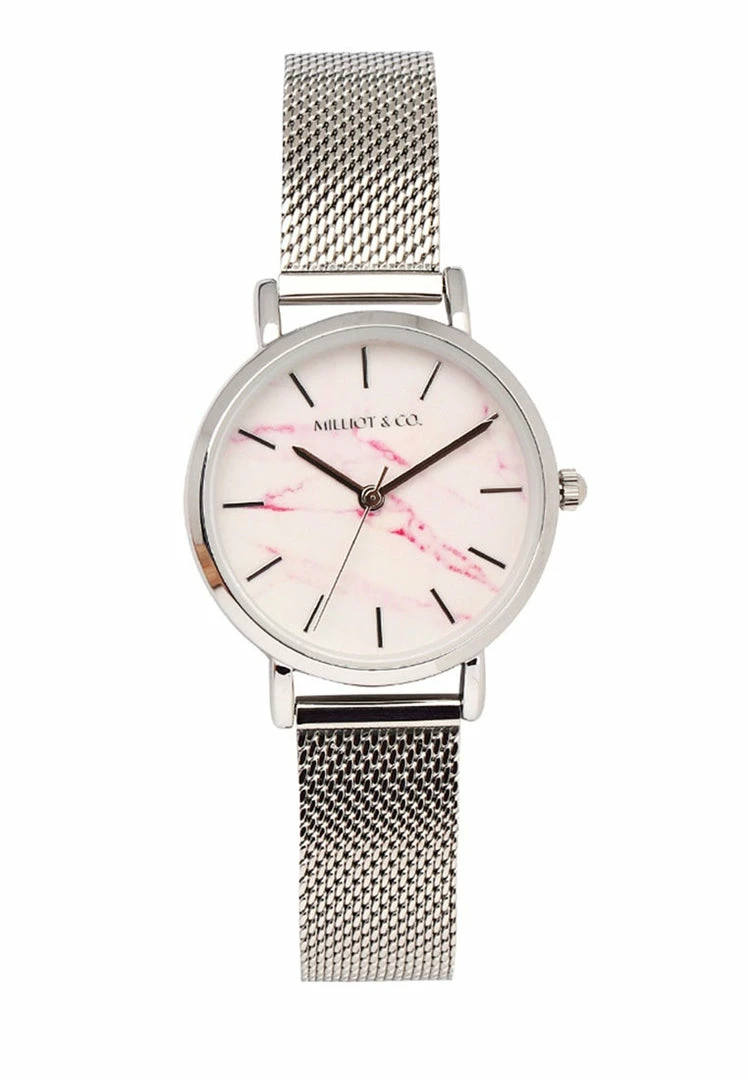 – Silver tone mesh strap watch with marble effect dial