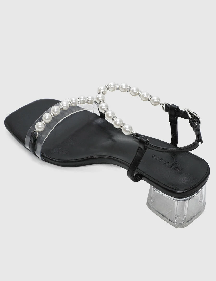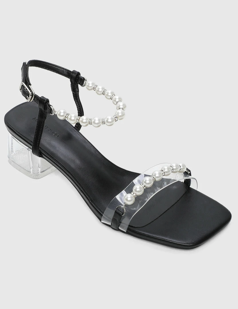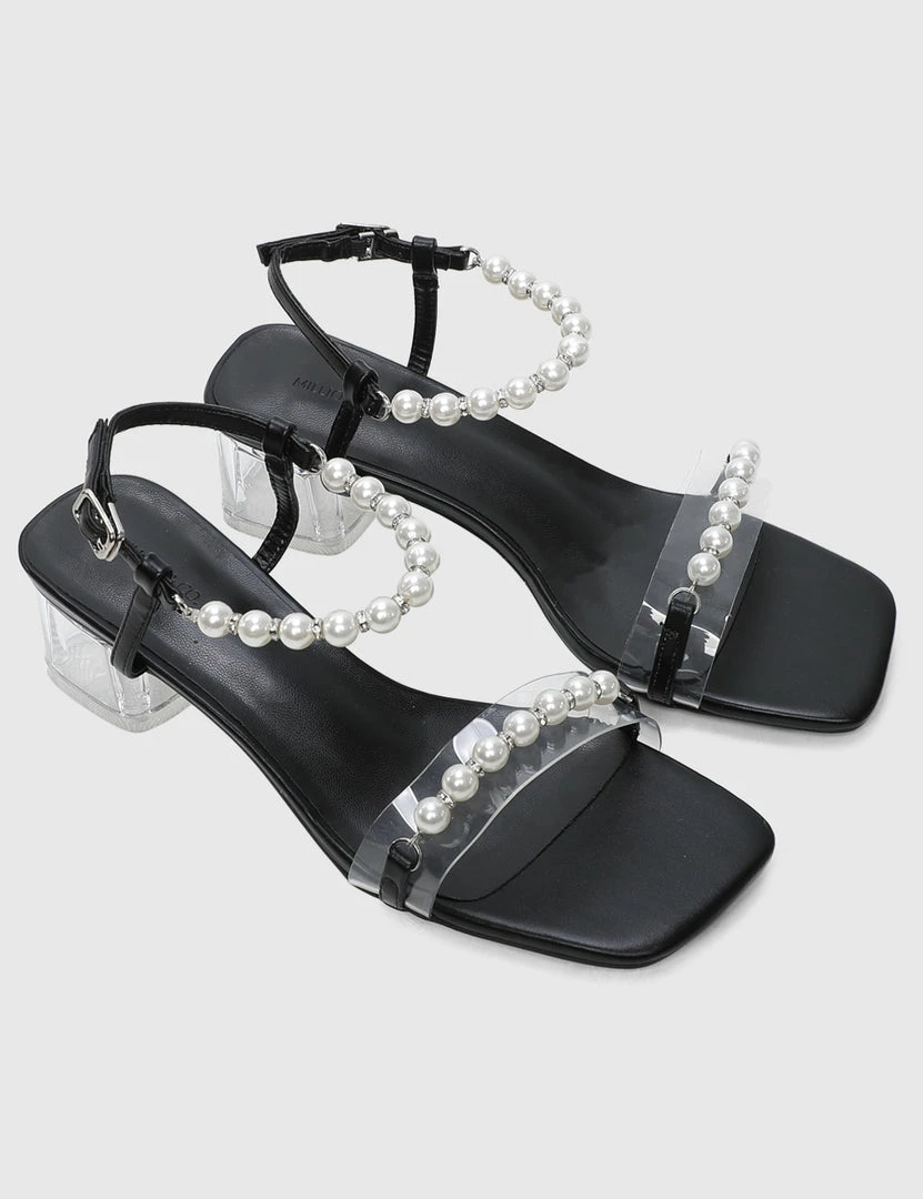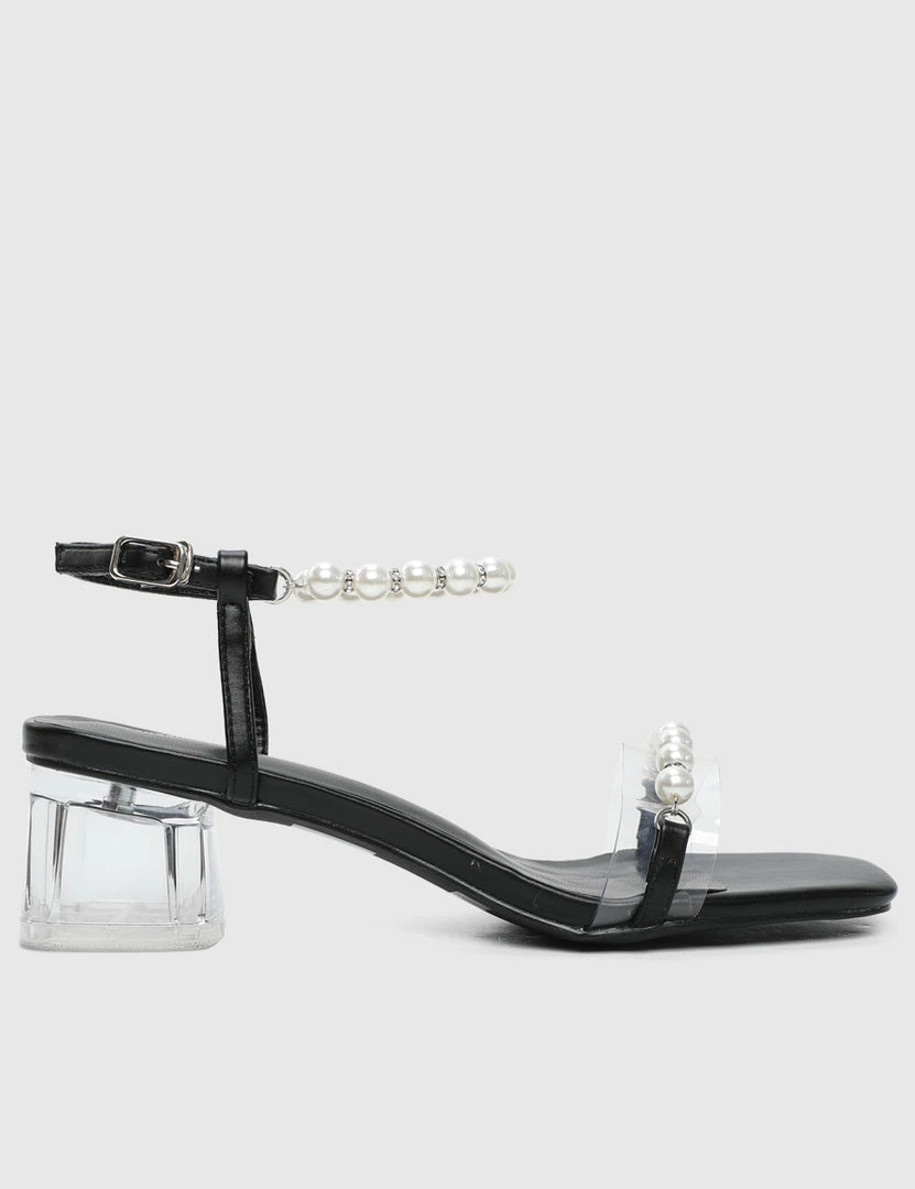 – Faux pearl accented strappy heels with transparent blocked heels