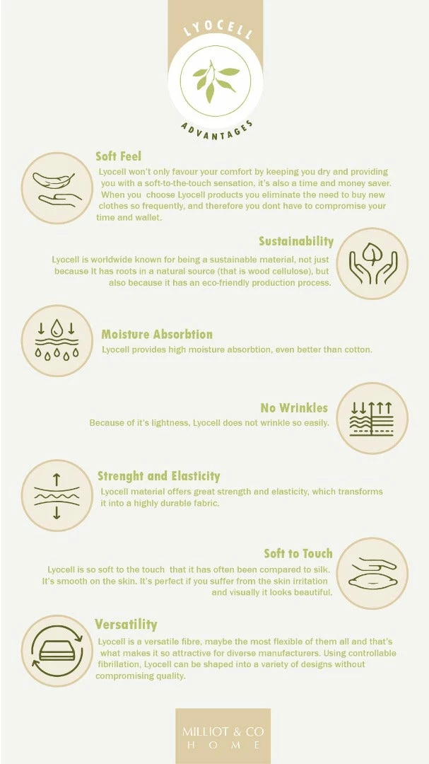 Lyocell, it starts with wood. Mostly, it’s eucalyptus, though oak and birch will also do. After being harvested, the wood is cut into penny-sized pieces and ground into a pulp, dissolved by the chemical amine oxide. What remains is raw cellulose – a sticky, viscous liquid. The mixture is pushed through spinnerets, and bright, white lyocell fibers emerge which, after washing and drying, are ready to be spun into yarn and eventually woven into fabric. It is also 50% more absorbent than cotton, soft to the touch, breathability, softness and the friendliness for the skin and hypoallergenic.