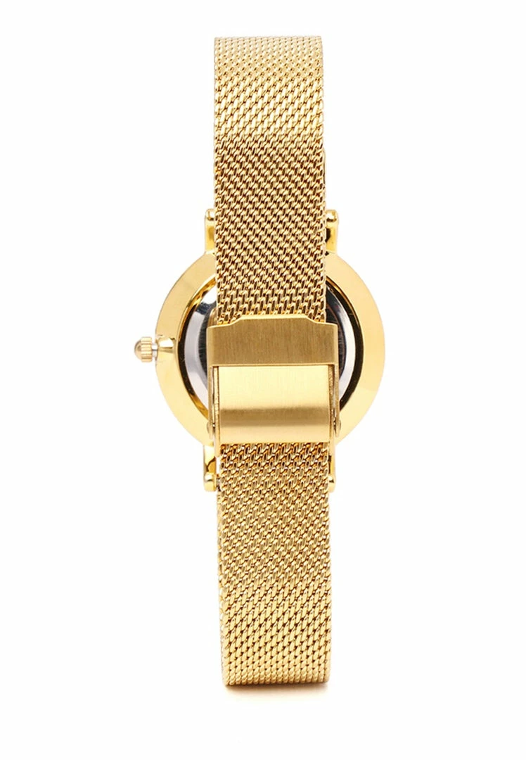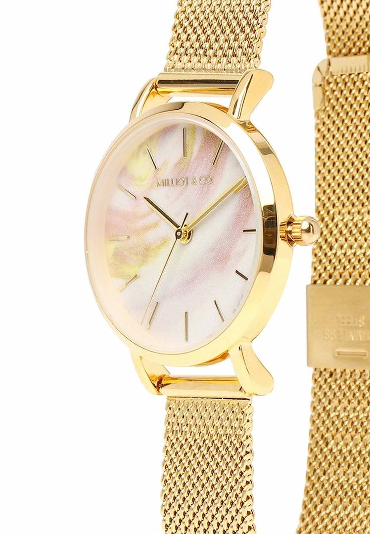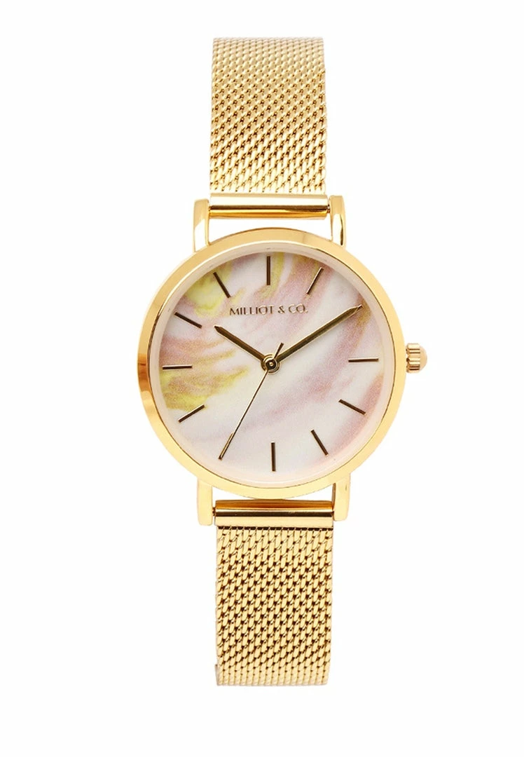 – Gold tone mesh strap watch with marble dial